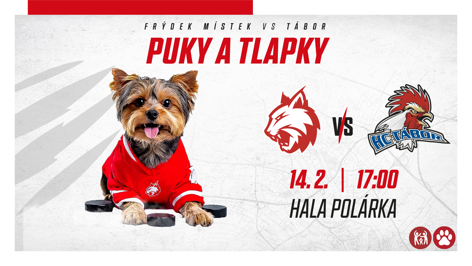 V dalším kole Maxa ligy čeká Frýdek-Místek na domácím ledě v sobotu 14.2. od 17:00 soupeř z Tábora. Toto utkání nebude obyčejné, neboť událost Puky a tlapky se vrací! Vezměte svého čtyřnohého parťáka na hokej a podpořte naše rysy!