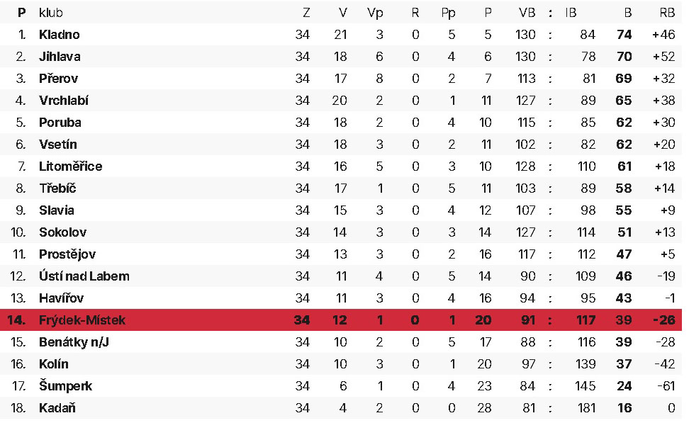 Jihlavští si tak vítězstvím vybojovali druhou příčku po základní části. Vítězem dlouhodobé soutěže se stali hokejisté Kladna. Zatímco soupeř z Vysočiny si teď bude moci v klidu odpočinout a nabrat síly před boji v play off, pro hokejisty Frýdku-Místku letošní sezona již skončila. A nutno říct, že na sezonu 2020/2021 nebudeme vzpomínat vůbec v dobrém. Konečné čtrnácté místo je vůbec nejhorším umístěním rysů po jejich postupu do druhé nejvyšší republikové soutěže. V příštím soutěžním ročníku by tohle umístění znamenalo sestup.